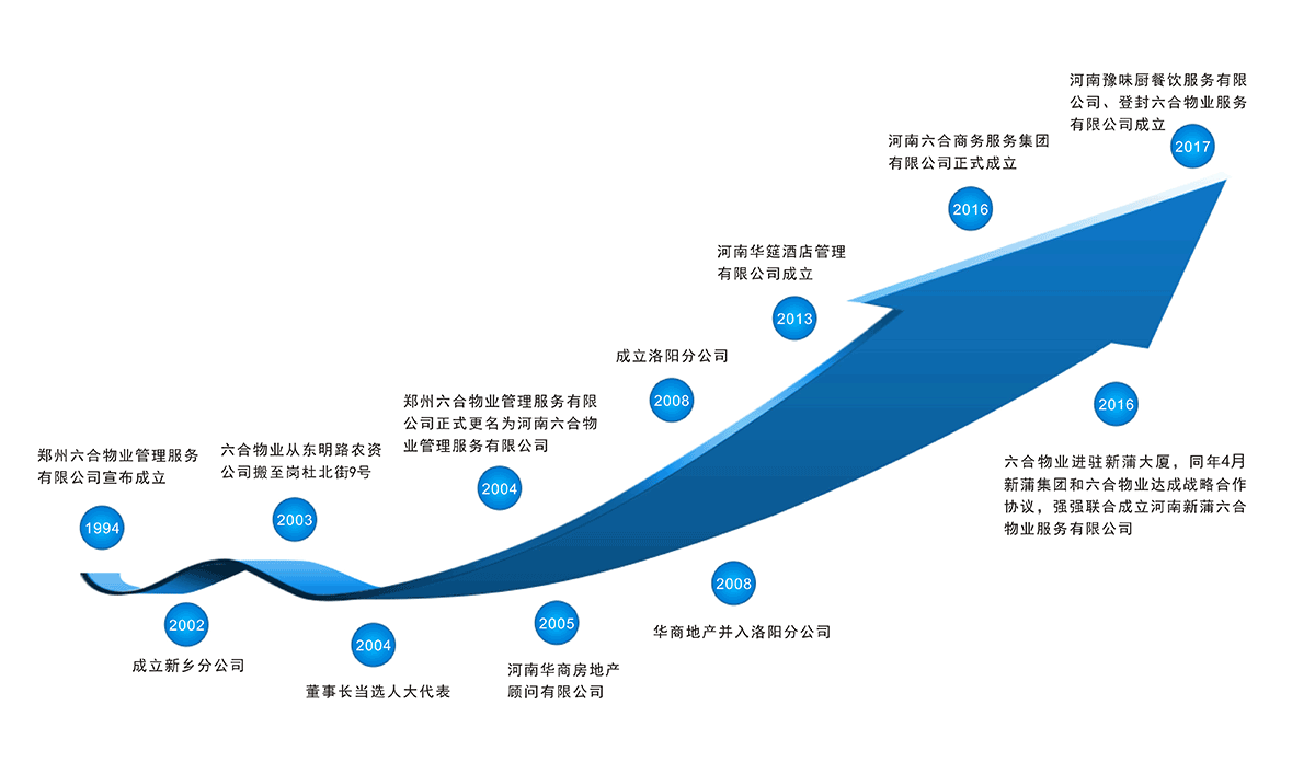 河南六合商務服務集團有限公司簡稱“河南六合集團”,源自于鄭州六合物業,創立于一九九四年。六合集團秉承“取之于社會,服務于社會,同創社會進步”的服務宗旨,歷經二十余年變革發展,累積了豐富的市場競爭、品質管理及團隊建設經驗,先后開展了“物業管理服務”、“物業資產經營”、“酒店運營管理”及“餐飲運營服務”等業務。六合集團立足于鄭州本土發展,并向周邊城市輻射,目前在鄭州,洛陽,新鄉,林州,禹州等地有多家下屬公司和加盟合作公司,包括: 河南六合物業管理服務有限公司、河南華筵酒店管理有限公司、河南六合物業管理服務有限公司洛陽分公司、新鄉六合物業管理服務有限公司、河南新蒲六合物業服務有限公司、河南華諾安物業服務有限公司、河南豫味廚餐飲服務有限公司、河南豫豐物全商貿有限公司。